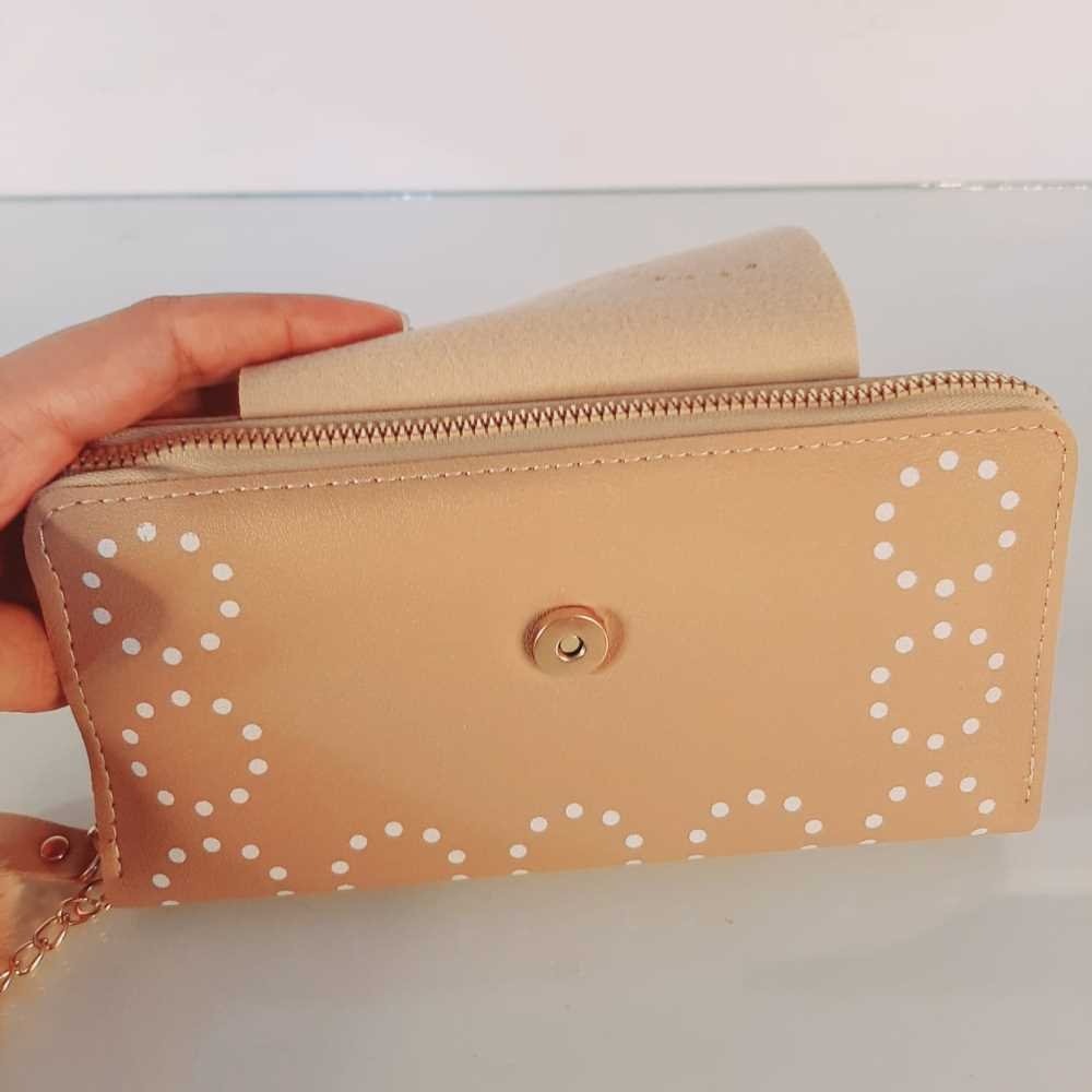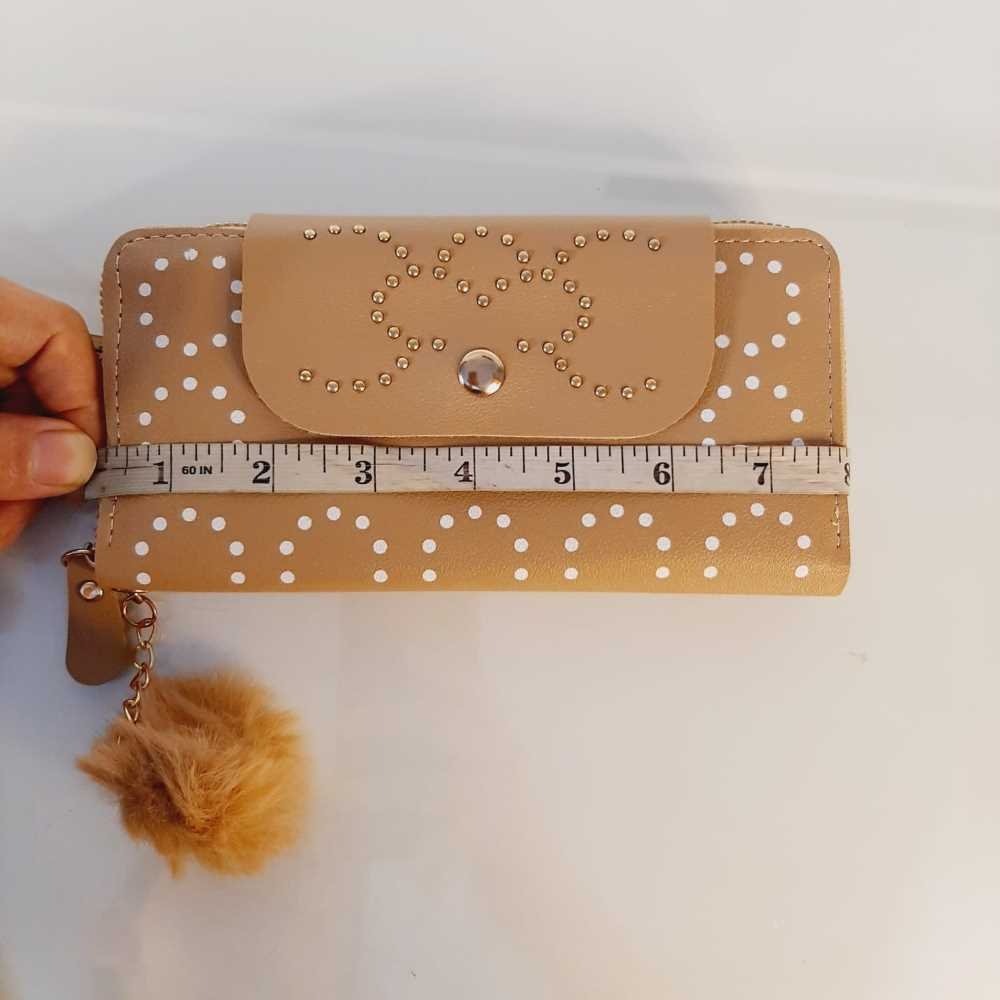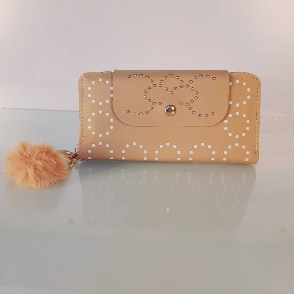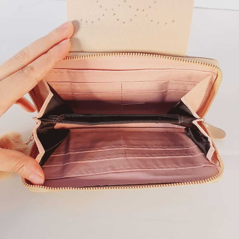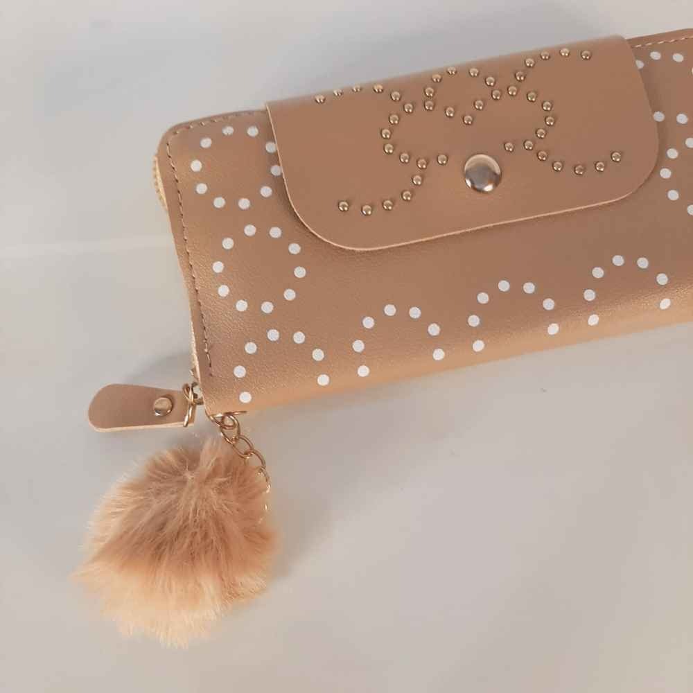 Zipper Wallet Purse With Pompom - Beige - W03